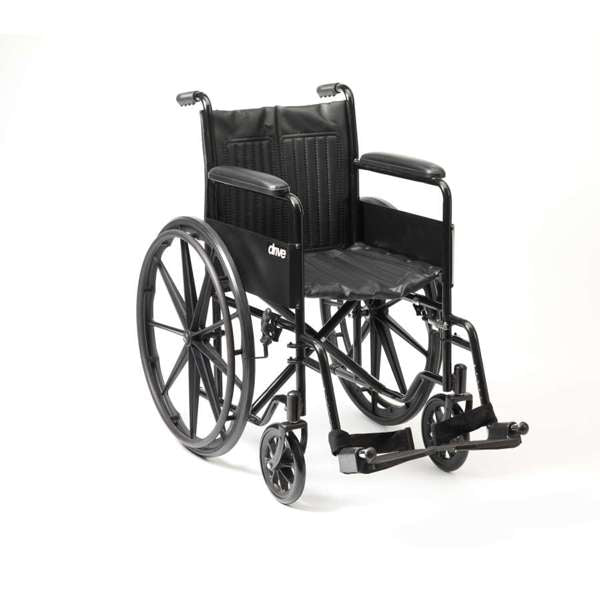 Robust steel frame folds easily for storage and transportation. Features vinyl upholstery and padded armrests for easy cleaning, height adjustable plastic footrests can be swung away or removed and attendant or user accessible parking brakes on rear wheels. Comes with puncture proof tyres, rear stepper tubes to allow attendant to safely mount curbs.